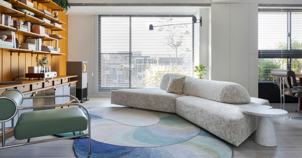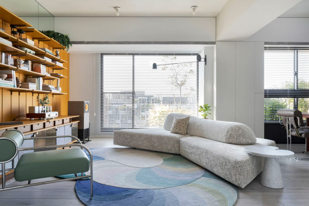 Σε αντίθεση με την παραδοσιακή διάταξη του σαλονιού της Ταϊβάν – όπου ο κύριος καναπές βρίσκεται στον τοίχο με ένα τραπεζάκι σαλονιού μπροστά – ο ασυνήθιστα διαμορφωμένος καναπές σε συνδυασμό με ένα μαρμάρινο βοηθητικό τραπέζι επιτρέπει στο ζευγάρι να αλλάζει ελεύθερα τον προσανατολισμό του, προσαρμόζοντας τα καθίσματα ανάλογα με τη διάθεση, την περίσταση ή τη συγκέντρωση. Όταν επισκέπτονται φίλοι, όλοι μπορούν να καθίσουν στρογγυλά, δημιουργώντας μια πιο χαλαρή και συναρπαστική ατμόσφαιρα. Ο σχεδιαστής εξηγεί ότι στη διαδικασία του, το σημαντικό είναι τόσο το τι κρύβεται όσο και το τι φαίνεται.