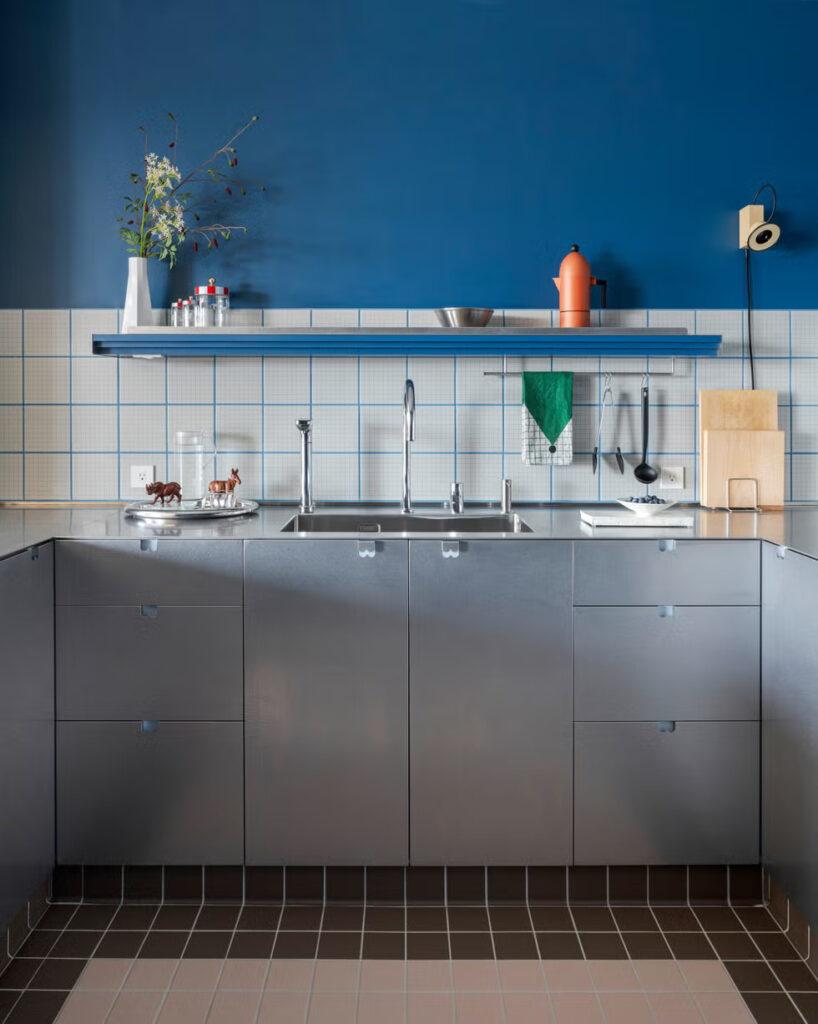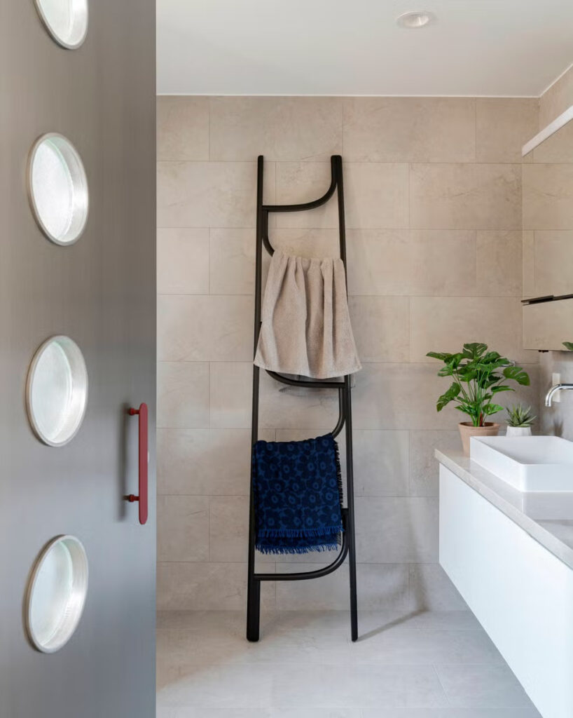 Στη συμβολή μεταξύ κουζίνας και καθιστικού, οι συσκευές φόρτισης που χρησιμοποιούνται καθημερινά είναι διακριτικά κρυμμένες, ενώ η σχισμή εξαερισμού του ψυγείου είναι έξυπνα τοποθετημένη στο κενό της πόρτας, διατηρώντας τη ροή του αέρα ενώ παραμένει εκτός ορατότητας. Άλλες κρυφές λύσεις αποθήκευσης διατηρούν τον χώρο εύκολο στη συντήρηση χωρίς να διαταράσσουν τη διαύγειά του. «Οι λειτουργίες ενός σπιτιού θα πρέπει να αναπνέουν φυσικά» λέει ο ChingJu. «Δεν θα πρέπει να απαιτούν προσπάθεια ή συνεχή σκέψη».