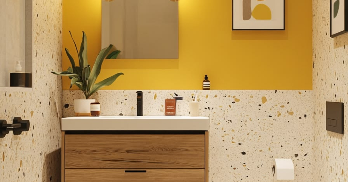 Ένας από τους πιο ενδιαφέροντες συνδυασμούς είναι αυτός του έντονου κίτρινου με το διαχρονικό terrazzo. Το μπάνιο της εικόνας αποπνέει μια ζεστή και σύγχρονη αισθητική, με έντονη έμφαση στη χρωματική αρμονία. Ο τοίχος στο βάθος είναι βαμμένος σε μια πλούσια, φωτεινή απόχρωση κίτρινου που λειτουργεί ως κεντρικό σημείο αναφοράς του χώρου. Το χρώμα αυτό δεν είναι απλώς διακοσμητικό – προσδίδει ενέργεια, φωτεινότητα και μια αίσθηση αισιοδοξίας, ενώ παράλληλα «αγκαλιάζει» τα υπόλοιπα στοιχεία, δημιουργώντας ένα φιλόξενο περιβάλλον. Το terrazzo, που καλύπτει το δάπεδο και τους τοίχους, λειτουργεί ως ιδανική αντίθεση στο έντονο κίτρινο. Με τη χαρακτηριστική του υφή και τα μικρά, διάσπαρτα κομμάτια σε γήινες αποχρώσεις, το terrazzo «σπάει» την μονοτονία και προσθέτει βάθος και ενδιαφέρον.