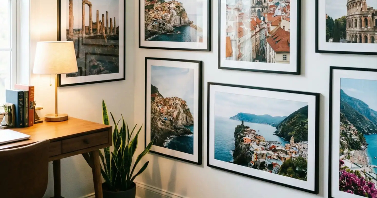 Παρόλο που οι φωτογραφίες διαφέρουν ως προς το περιεχόμενο, το κοινό στυλ (χρώματα, φωτισμός, αισθητική) τις ενώνει σε ένα ενιαίο σύνολο. Αυτό δημιουργεί μια οπτική αφήγηση που τραβά το βλέμμα και προσκαλεί τον παρατηρητή να «ταξιδέψει» από εικόνα σε εικόνα. Η διάταξη εκμεταλλεύεται όλο τον διαθέσιμο χώρο του τοίχου, μετατρέποντάς τον σε κεντρικό στοιχείο του δωματίου. Παράλληλα, η γκαλερί ενσωματώνεται αρμονικά στο υπόλοιπο περιβάλλον. Το ξύλινο γραφείο, το φωτιστικό με ζεστό φως και το φυτό στο πάτωμα προσθέτουν μια αίσθηση ζεστασιάς και ισορροπίας.