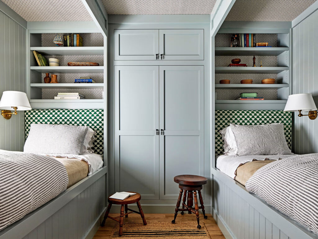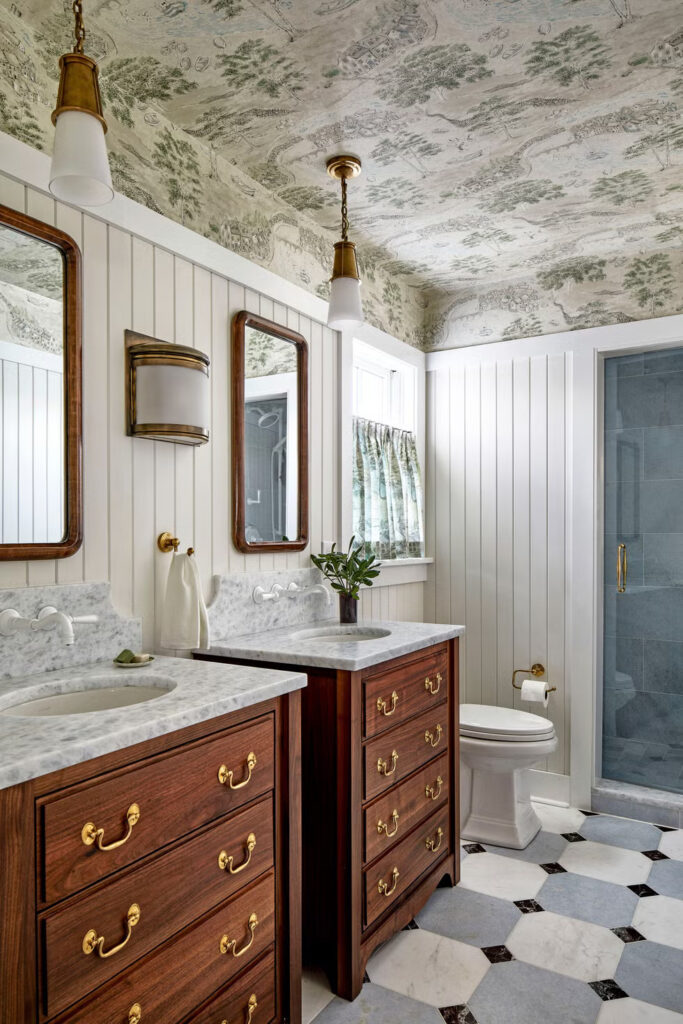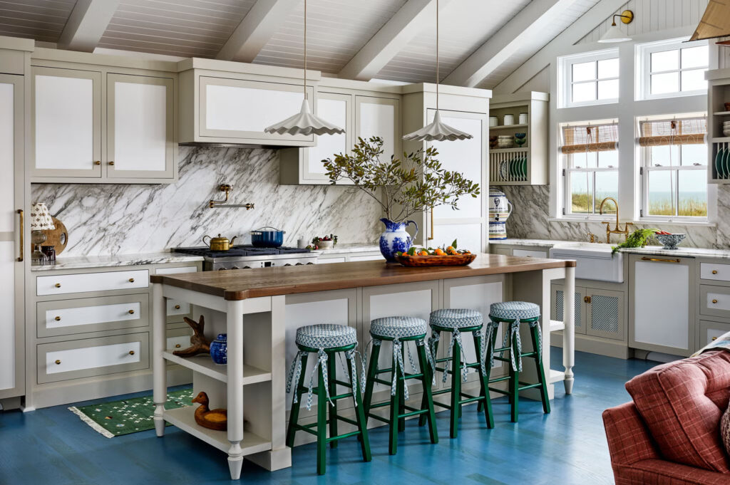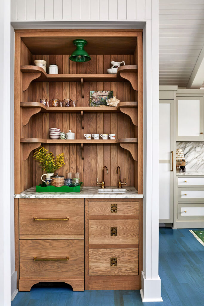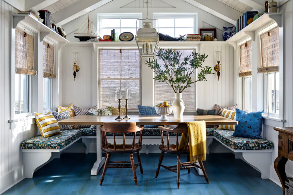 Για να ανταποκριθούν σε αυτή την εντολή, οι σχεδιαστές βασίστηκαν σε ξυλουργικές εργασίες εμπνευσμένες από την εποχή, υφάσματα υψηλής ποιότητας και φινιρίσματα που επιλέχθηκαν ειδικά, ενώ παράλληλα άλλαξαν τη διάταξη ώστε να αντικατοπτρίζει τις πραγματικές ανάγκες των ιδιοκτητών σπιτιού. Μια υποαπασχολούμενη ντουλάπα έξω από την κουζίνα αναδιαμορφώθηκε σε γωνιά καφέ και σχεδιάστηκε για να μοιάζει με μια «πρωτότυπη» εντοιχισμένη ντουλάπα. Η ηλιόλουστη γωνιά της τραπεζαρίας – που έχαν ”δανειστεί” από την περιμετρική βεράντα – προσφέρει άνετα καθίσματα για 12 άτομα, ένας αριθμός που δεν είναι ασυνήθιστος στο αποκορύφωμα του καλοκαιριού.