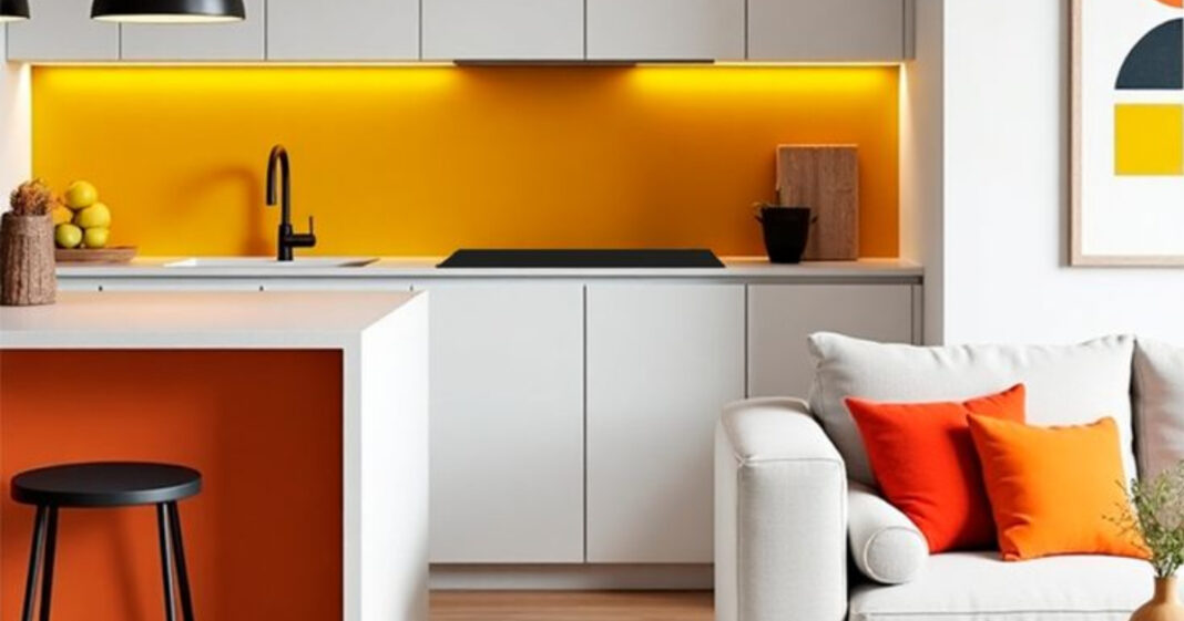 Η φωτογραφία απεικονίζει έναν σύγχρονο, ενιαίο χώρο κουζίνας και καθιστικού, ο οποίος κυριαρχείται από μια καθαρή, μινιμαλιστική αισθητική με κυρίως λευκές επιφάνειες. Το ενδιαφέρον όμως κρύβεται στις δόσεις έντονου χρώματος, οι οποίες είναι στρατηγικά τοποθετημένες για να δώσουν ζωντάνια και προσωπικότητα στον χώρο, χωρίς να κουράζουν.