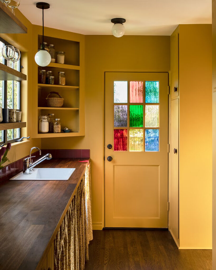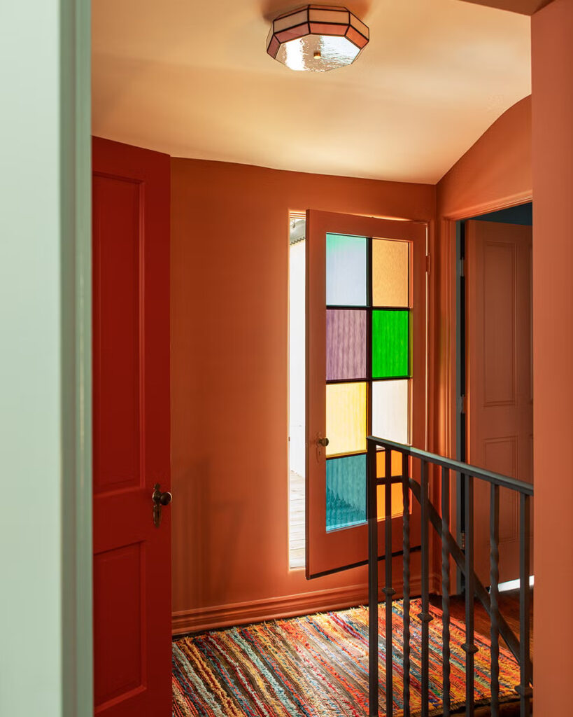 Το χρωματιστό γυαλί ολοκληρώνει αυτό το χαρούμενο σπίτι σε αποικιακό στυλ στην Καλιφόρνια, έργο της Frances Merrill της Reath Design. Τόσο η κουζίνα όσο και η μπροστινή πόρτα διαθέτουν ένα συνονθύλευμα από γυαλί στα χρώματα του ουράνιου τόξου, ενώ στο σαλόνι ένα αντίκα κρεμαστό φωτιστικό από βιτρό προσθέτει ένα ακόμη στοιχείο χρωματιστού φωτός στο σπίτι.