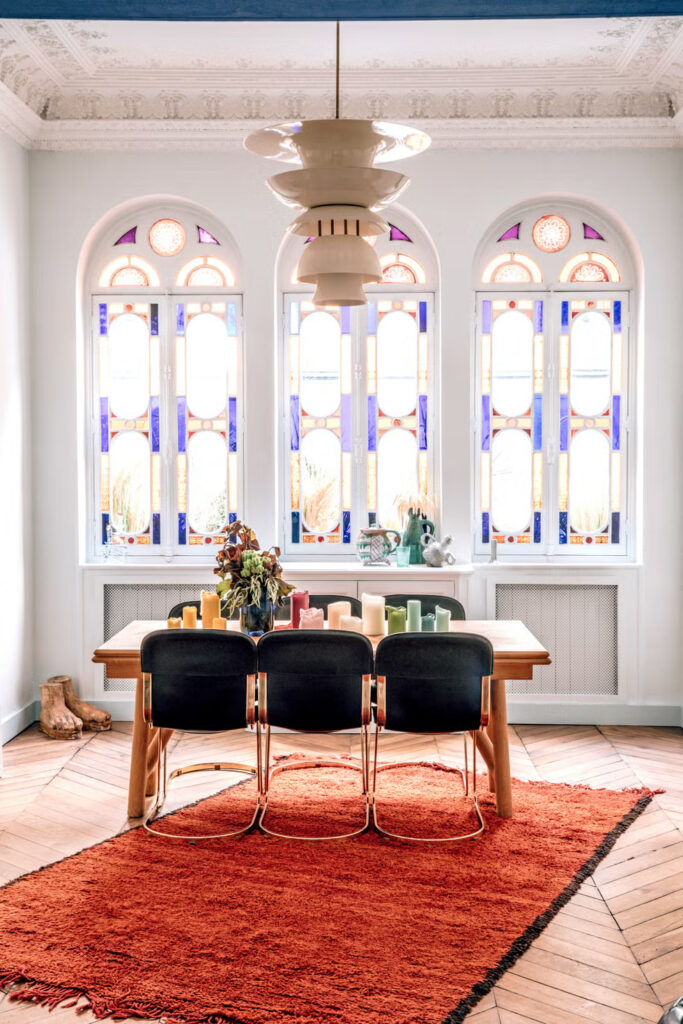 Αυτά τα εντυπωσιακά παράθυρα που μοιάζουν με καθεδρικό ναό ορίζουν αυτή την παριζιάνικη κατοικία. Το σπίτι του καλλιτεχνικού διευθυντή Jean-Christophe Aumas, πιστεύεται ότι κάποτε ήταν το σπίτι ενός μάγου (ενός ατόμου που ασκεί μυστικιστικές τέχνες). Ο Jean-Christophe τόνισε τα εντυπωσιακά παράθυρα φέρνοντας πινελιές χρώματος που αντηχούν τους πολύτιμους τόνους του γυαλιού. Ωστόσο, το εσωτερικό εξελίσσεται συνεχώς ανάλογα με τις δημιουργικές του ιδιοτροπίες: «Μπορεί να ξυπνήσω ένα πρωί και ξαφνικά να αποφασίσω να αλλάξω το χρώμα ενός τοίχου ή να μετακινήσω τα έπιπλα» λέει.