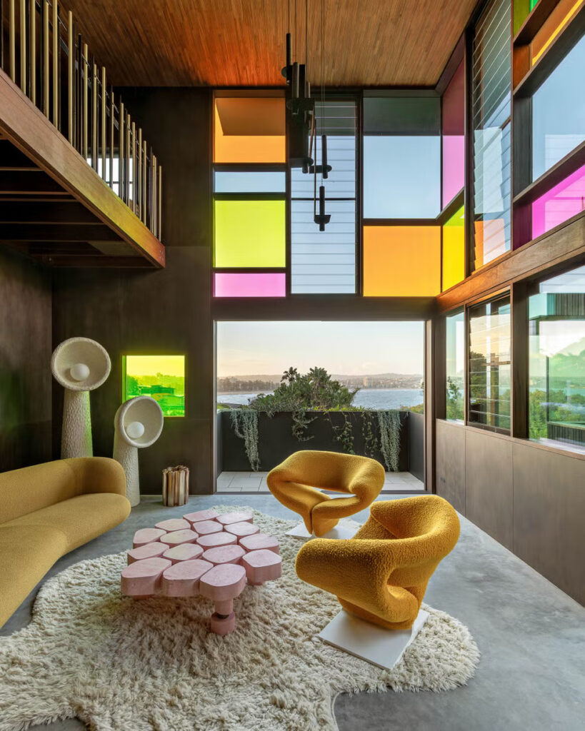 «Ο Mondrian ήταν η αρχική αναφορά» λέει ο σχεδιαστής εσωτερικών χώρων Jase Sullivan για τα εντυπωσιακά βιτρό παράθυρα του Holocene House, μιας πρωτοποριακής κατοικίας στο Σίδνεϊ. «Η πρόκληση ήταν να τα εξισορροπήσουμε με την εκπληκτική όψη του σπιτιού. Έπρεπε να είμαστε τολμηροί στις επιλογές μας, αλλά να τις κάνουμε να αισθάνονται συνεκτικές και συνδεδεμένες με το τοπίο» προσθέτει.