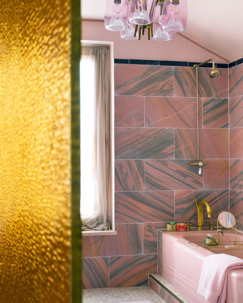 Το καπνιστό, βιτρό και φιμέ τζάμι ήταν μια δημοφιλής διακοσμητική πινελιά τη δεκαετία του 1970, και έτσι αυτό το κεχριμπαρένιο διαχωριστικό ντους ταιριάζει απόλυτα στο ρετρό σπίτι των ονείρων της Winnie Williams. Το βικτοριανό ακίνητο ξεχειλίζει από χρώματα, μοτίβα και έπιπλα που συνοψίζουν την ατρόμητη διακοσμητική ενέργεια της εποχής. «Είναι διασκεδαστικό να χρησιμοποιείς παλιά κομμάτια» λέει. «Συνήθως ξέρω ότι θέλω ένα βασικό πράγμα σε έναν χώρο και περιμένω μέχρι να το βρω».