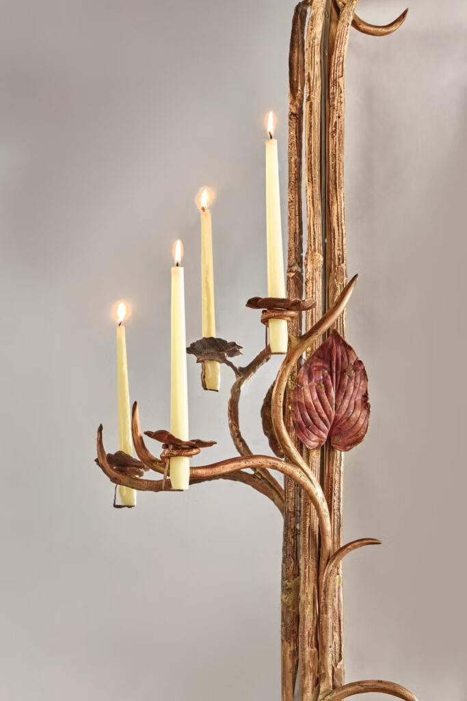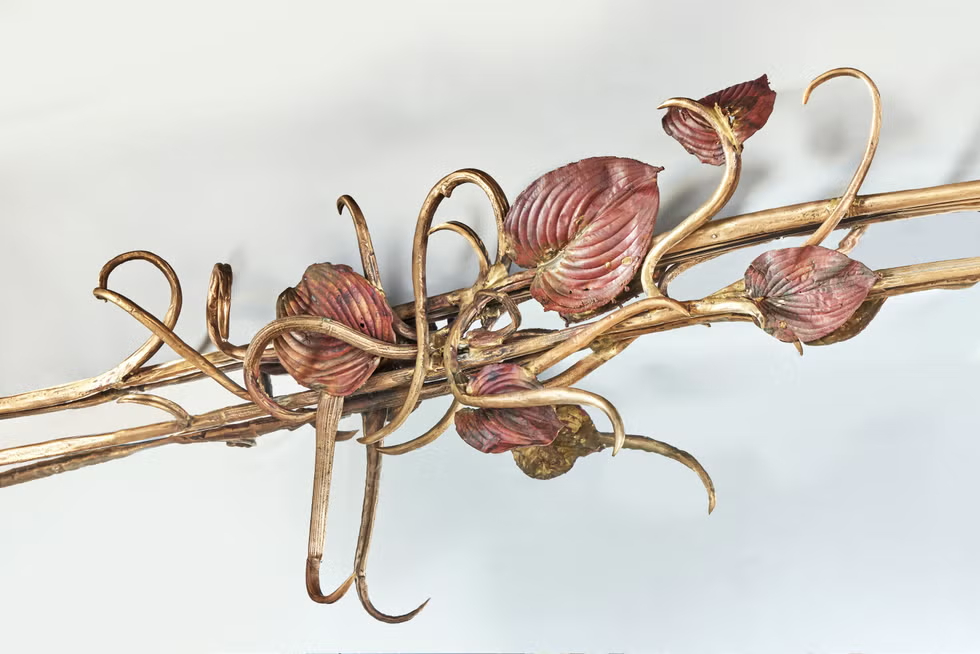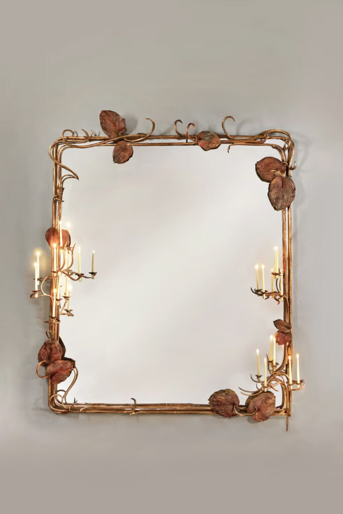 Η παραγγελία σηματοδότησε ένα σημείο καμπής για την Claude Lalanne. Μέχρι τότε, ήταν περισσότερο γνωστή για τα οικεία, συχνά σουρεαλιστικά αντικείμενα όπως κοσμήματα, επιτραπέζια σκεύη και μικρά γλυπτά διακοσμημένα με βοτανικά και σωματικά μοτίβα. Οι καθρέφτες της έδωσαν την ευκαιρία να κλιμακώσει δραματικά το όραμά της. Κάθε ένα πλαισιώνεται από ελικοειδή, χειροποίητα οργανικά σχήματα—είναι διάσπαρτα σε χυτά φύλλα που συλλέχθηκαν από τον κήπο της, τα οποία διατήρησε σε μέταλλο και τα διαέταξε σε έναν τετράγωνο ρυθμό. Τρία από αυτά διαθέτουν κηροπήγια, προσθέτοντας μια επιπλέον πινελιά φωτός και φαντασίας.