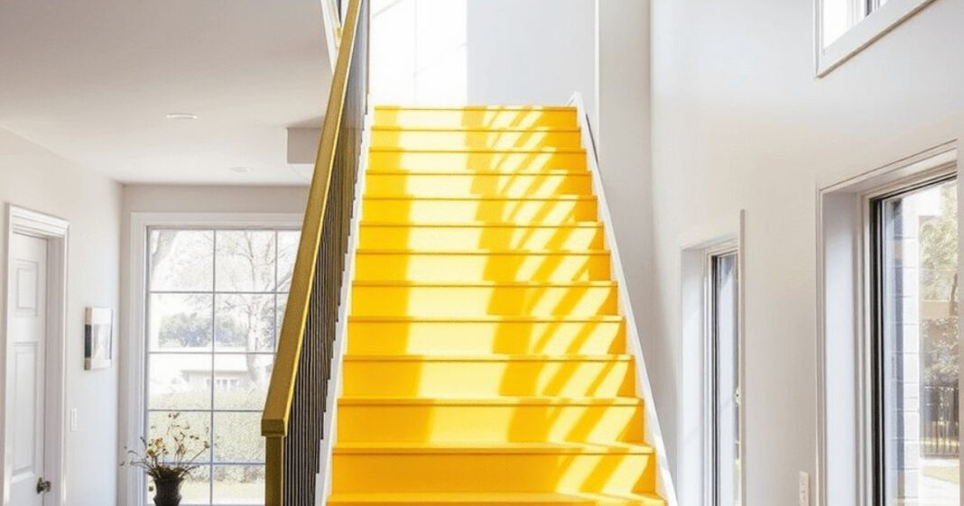 Στη φωτογραφία βλέπουμε έναν φωτεινό, σύγχρονο εσωτερικό χώρο – μια είσοδο σπιτιού – όπου κυριαρχεί μια εντυπωσιακή σκάλα. Το περιβάλλον είναι λιτό και κομψό, με λευκούς τοίχους και μεγάλα παράθυρα που επιτρέπουν στο φυσικό φως να πλημμυρίζει το χώρο. Η σκάλα αποτελεί το κεντρικό στοιχείο της εικόνας και ξεχωρίζει αμέσως χάρη στο έντονο, ζωηρό κίτρινο χρώμα της. Το χρώμα αυτό είναι φωτεινό και θερμό, σχεδόν ηλιόλουστο, και έρχεται σε έντονη αντίθεση με την ουδέτερη παλέτα του υπόλοιπου χώρου.