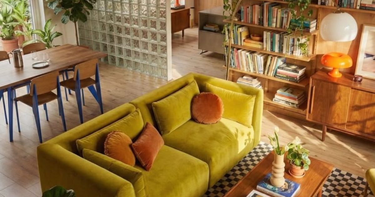 Ο πιο κάτω χώρος είναι ένα φωτεινό και ζεστό καθιστικό με ανοιχτή διαρρύθμιση που συνδυάζει σαλόνι, τραπεζαρία και βιβλιοθήκη. Στο κέντρο του σαλονιού βρίσκεται ένας καναπές σε ζωηρή απόχρωση του πράσινου, διακοσμημένος με μαξιλάρια σε γήινους τόνους, που δίνει χαρακτήρα και ζωντάνια. Μπροστά του, ένα ξύλινο τραπεζάκι σαλονιού με βιβλία και διακοσμητικά, τοποθετημένο πάνω σε ένα ασπρόμαυρο χαλί με γεωμετρικό μοτίβο που προσθέτει αντίθεση και οπτικό ενδιαφέρον. Δίπλα, ένα μεγάλο φυτό ενισχύουν εξαιρετικά τη φυσική αίσθηση του χώρου.