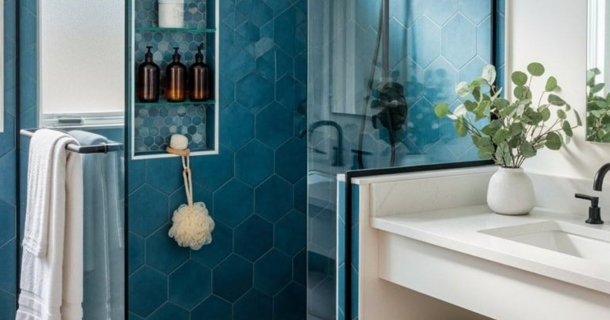 Το κεντρικό στοιχείο που κλέβει την παράσταση είναι τα μπλε εξαγωνικά πλακίδια (honeycomb tiles) που καλύπτουν τους τοίχους της ντουζιέρας. Η επιλογή αυτή προσθέτει βάθος και μια αίσθηση πολυτέλειας, ενώ η ματ υφή τους και οι διακυμάνσεις στον τόνο του μπλε θυμίζουν τα χρώματα του ωκεανού. Η γεωμετρική αυστηρότητα των πλακιδίων εξισορροπείται από το δάπεδο της ντουζιέρας, το οποίο είναι επενδυμένο με φυσικό βότσαλο, προσφέροντας μια spa εμπειρία και μια γήινη αίσθηση στο πέλμα.