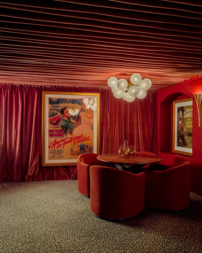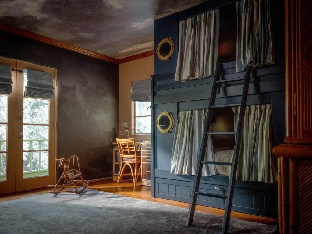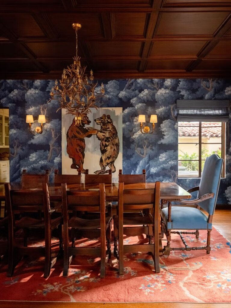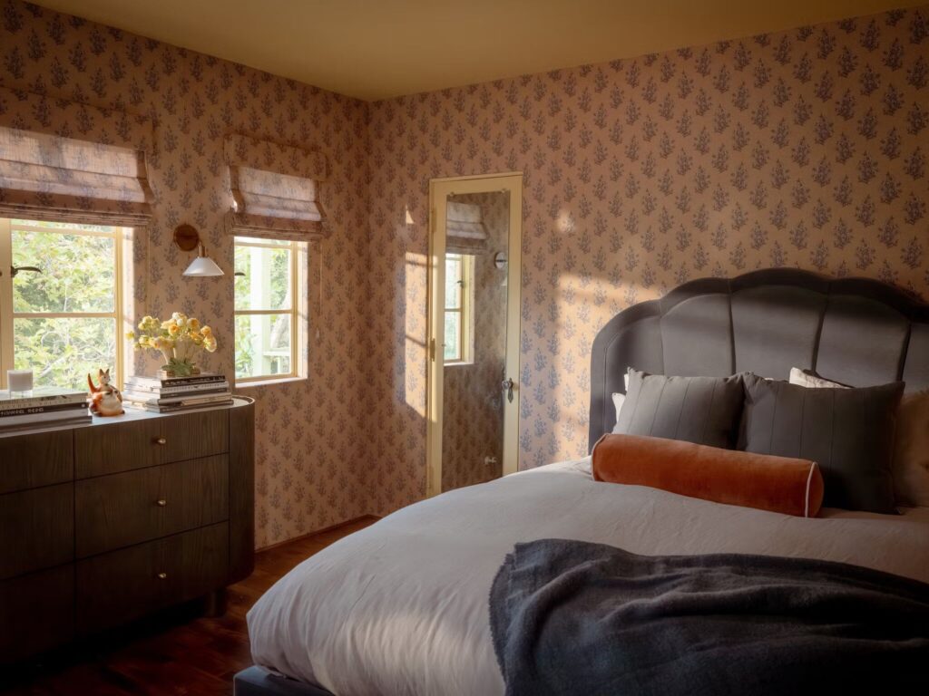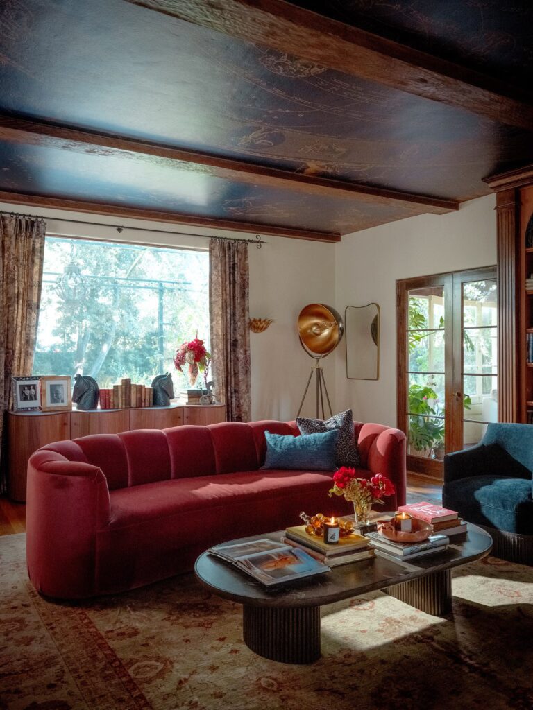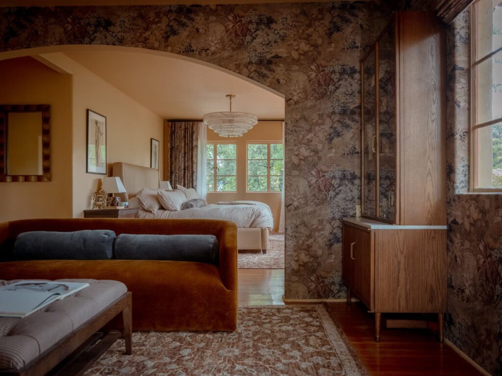 Αν και είχε υποστεί μια ισοπεδωτική ανακαίνιση τη δεκαετία του ’90, μπορούσε να αισθανθεί ένα μυστικισμό του παλιού Χόλιγουντ μέσα του. Η σχεδιάστρια είχε πολλή δουλειά για αυτή την ανακαίνιση, ειδικά αφού η κουζίνα, το κύριο μπάνιο και το υπόγειο σε στυλ speakeasy καταστράφηκαν εντελώς. Αλλά ο χώρος που προκύπτει, πλούσιος σε ταπετσαρίες εμπνευσμένες από το ύφασμα, χαλιά με λεοπάρ μοτίβο και ψηφιδωτά πλακάκια κατά παραγγελία, αντηχεί με πλούσιο, πολυεπίπεδο ρομαντισμό. Κάθε δωμάτιο ξεχειλίζει από ιστορικές αναφορές σχεδιασμού που θα έκαναν έναν λάτρη των κλασικών ταινιών να λιποθυμήσει: Για παράδειγμα, τα μιούζικαλ RKO της δεκαετίας του 1930 ενέπνευσαν την «υπέροχη Art Deco/νεοκλασική γραμμή» σε όλη την έκταση.