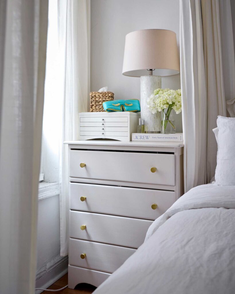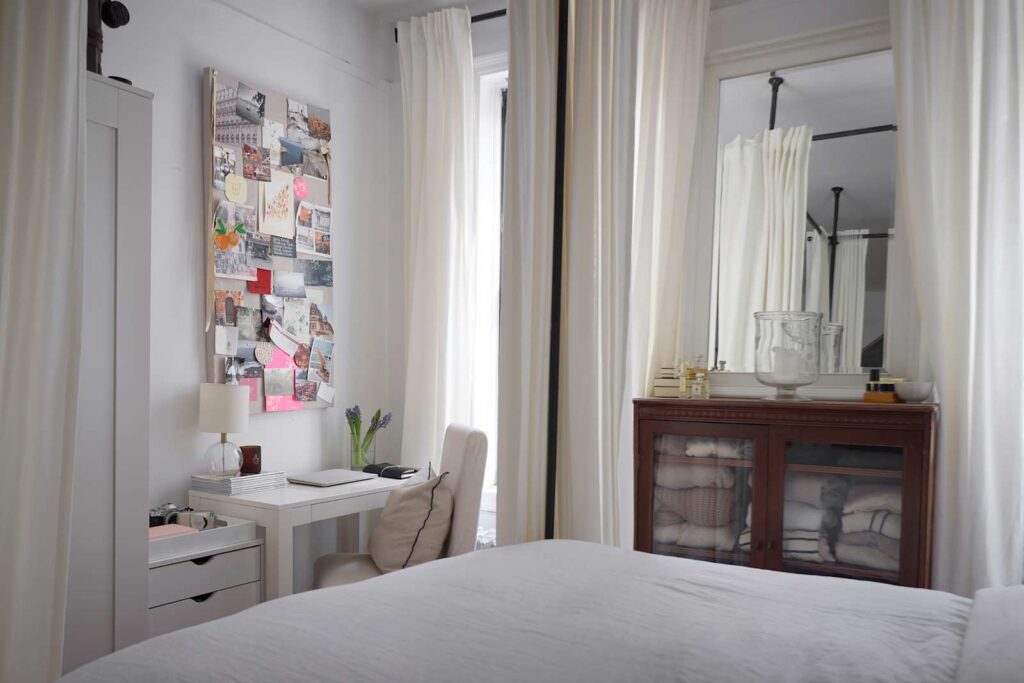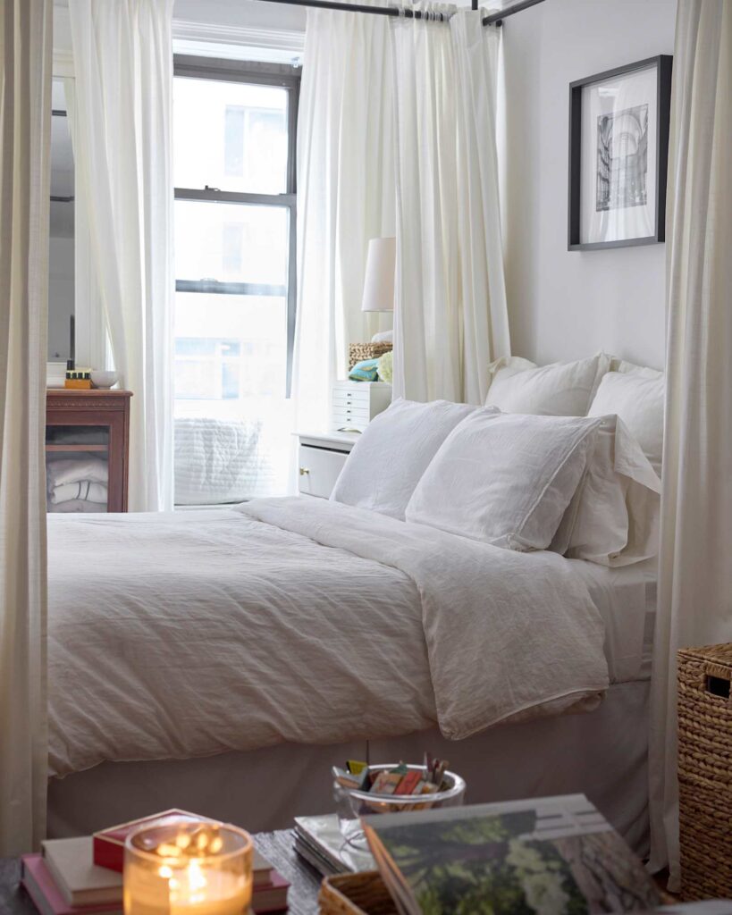 Το DIY για το οποίο η Macey είναι πιο περήφανη είναι το – πολύ καλό για ενοικιαζόμενα – κρεβάτι με ουρανό που δημιούργησε. «Χρησιμοποίησα οκτώ μεμονωμένα πάνελ κουρτινών από το IKEA και δύο σετ διαχωριστικών δωματίων από το Amazon. Ήταν πραγματικά απλό και κάνει τη μεγαλύτερη εντύπωση. Είναι ένα από τα αγαπημένα μου πράγματα στο διαμέρισμα. Κάνει τον χώρο να φαίνεται πραγματικά εντυπωσιακός. Επίσης, κλείνω τις κουρτίνες όταν πέσω για ύπνο το βράδυ, ώστε να το νιώθω σαν έναν εντελώς ξεχωριστό χώρο».