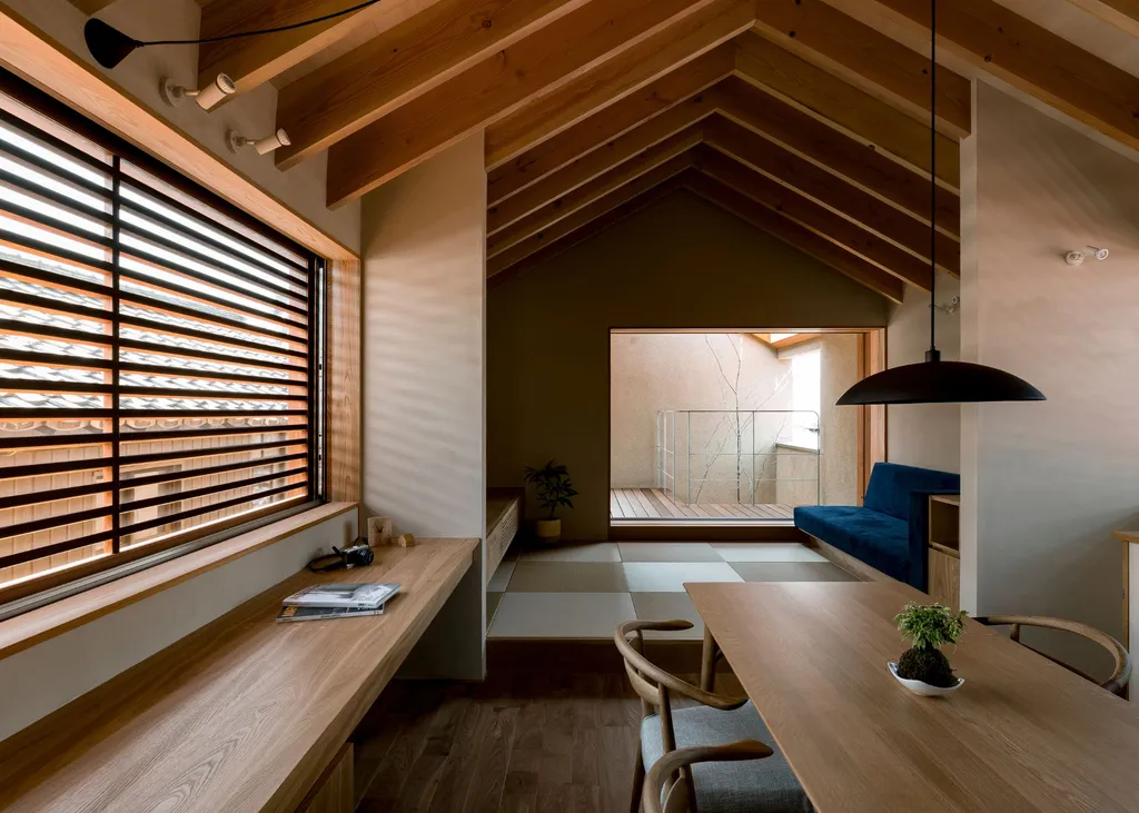 Στο εσωτερικό, η αρχιτεκτονική γιορτάζει την αυτοσυγκράτηση. Εκτεθειμένες ξύλινες δοκοί ευθυγραμμίζουν την οροφή, η υφή τους ζεσταίνει το κατά τα άλλα μινιμαλιστικό εσωτερικό. Οριζόντιες περσίδες φιλτράρουν το ηλιακό φως σε μεταβαλλόμενες λωρίδες που γλιστρούν στους τοίχους καθ’ όλη τη διάρκεια της ημέρας, προσθέτοντας μια γραφική πινελιά στον περιορισμένο χώρο. Η έλλειψη ενός παραδοσιακού κήπου έφερε θύλακες πρασίνου σε εσωτερικούς χώρους. Μικρές αυλές διαθέτουν αισθητικά διαμορφωμένα φυτά και πέτρες ενώ στους όγκους διπλού ύψους, οι φεγγίτες δημιουργούν έναν κάθετο «ουρανό», επιτρέποντας στα δέντρα να αναπτύσσονται ελεύθερα.
