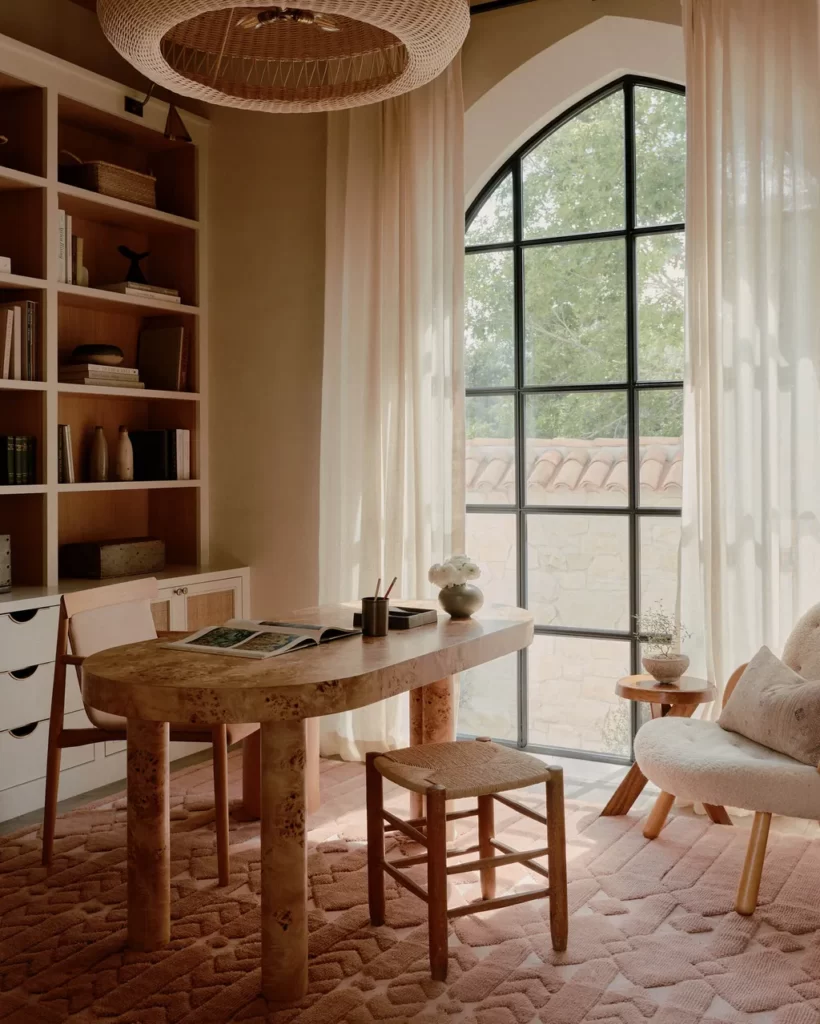 «Αρχιτεκτονικά, συχνά βλέπεις στοιχεία όπως καμάρες, κόγχες και αρκετά συμπαγείς, υφασμάτινες επιφάνειες» εξηγεί η Kate. «Υπάρχει επίσης μια απαλότητα στις μορφές, όχι πολλές σκληρές γραμμές, περισσότερες καμπύλες και οργανικά σχήματα. Το φως παίζει επίσης μεγάλο ρόλο – έχει πάντα να κάνει με τη δημιουργία χώρων που αισθάνονται ανοιχτοί και ευάεροι».