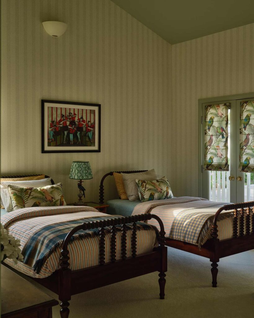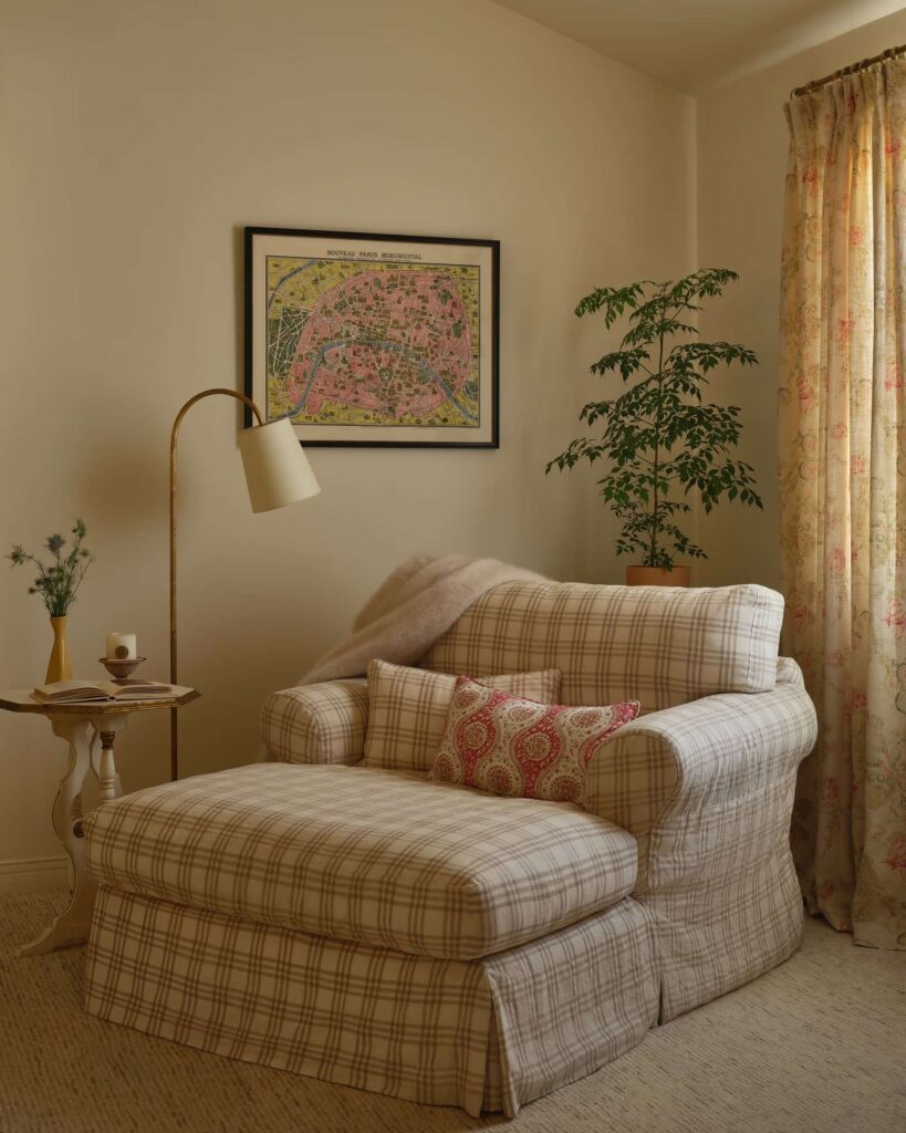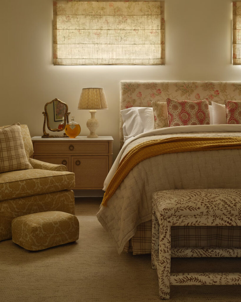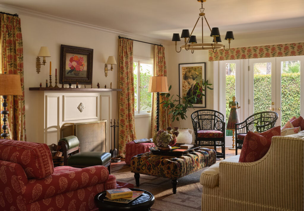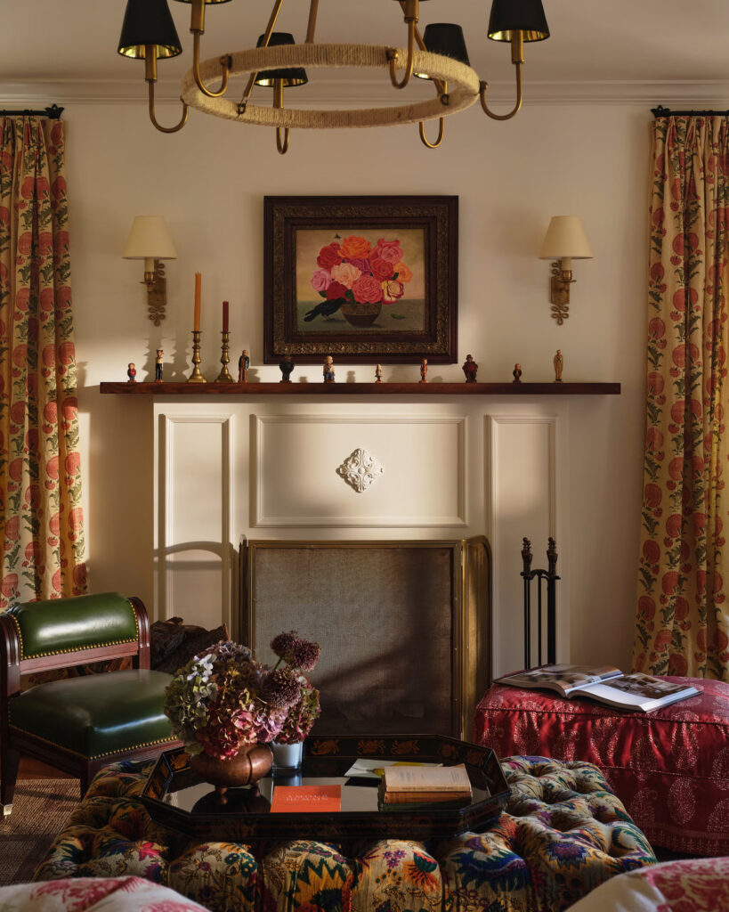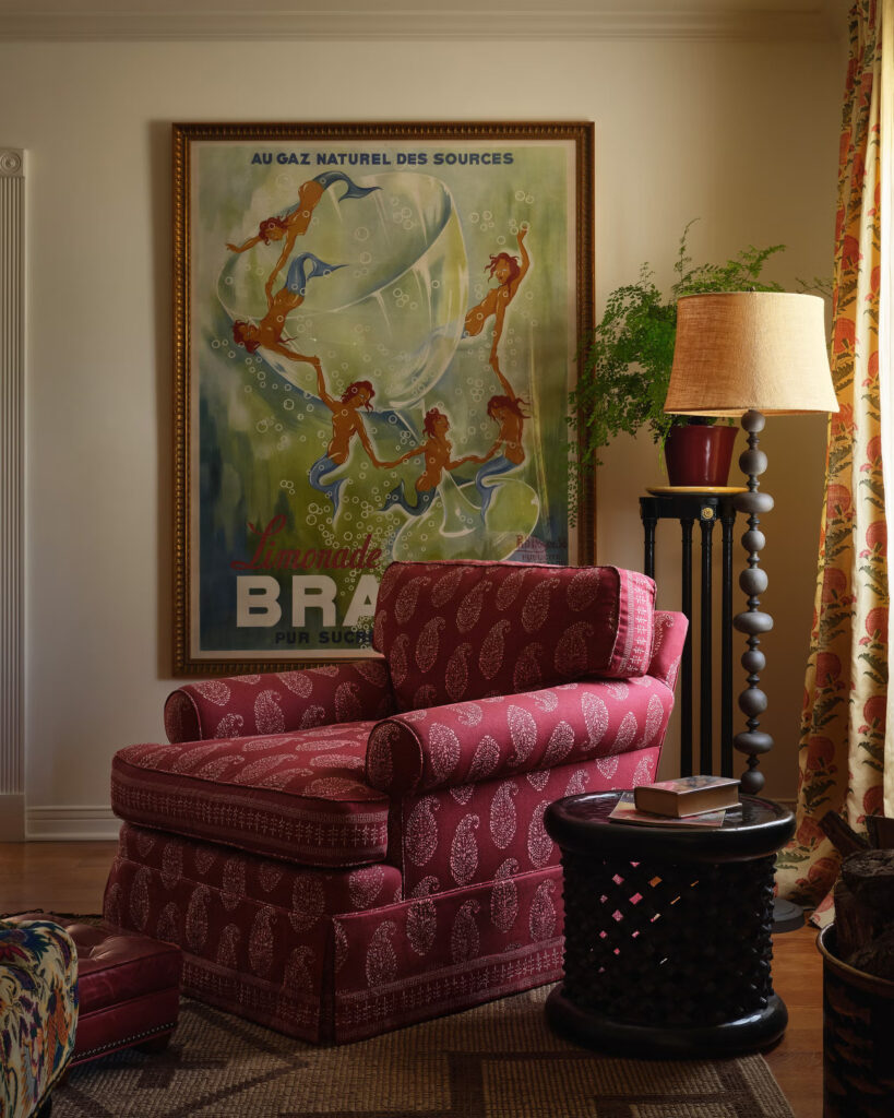 Οι πελάτες της είχαν μια πληθώρα επίπλων υψηλής ποιότητας και δεν υπήρχε λόγος να τα ξεφορτωθούν. Αντ’ αυτού, ανανέωσε τα περισσότερα από αυτά με όμορφα υφάσματα και ενσωμάτωσε κλασικά vintage κομμάτια, τόσο παραδοσιακά όσο και mid-century, για να δημιουργήσει μια σύνθετη, πολυεπίπεδη εμφάνιση. Πολυτελή φωτιστικά, ειδικά σχεδιασμένα διακοσμητικά παραθύρων και πλούσια ταπετσαρία συμβάλλουν στην αναβαθμισμένη εμφάνιση, μετατρέποντας ένα κουρασμένο εσωτερικό σε κάτι που ταιριάζει καλύτερα στις προσωπικότητες των ιδιοκτητών σπιτιού.