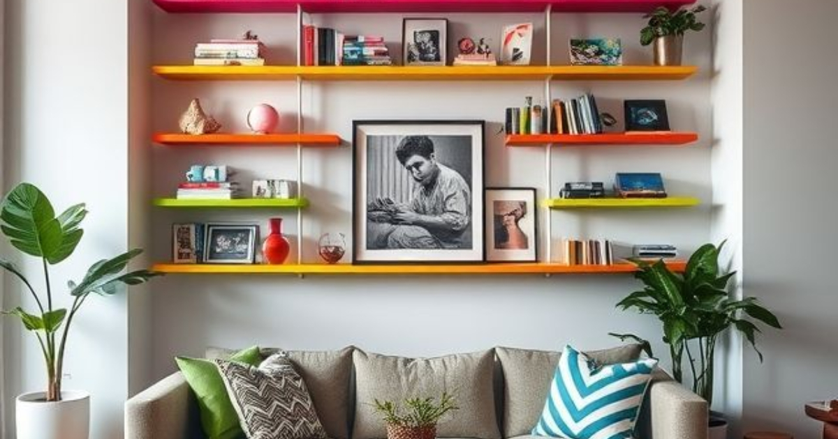 Το πιο εντυπωσιακό χαρακτηριστικό του σαλονιού είναι αναμφίβολα τα πολύχρωμα ράφια στον τοίχο πίσω από τον καναπέ, σε έντονες αποχρώσεις όπως ροζ, πορτοκαλί, κίτρινο και πράσινο. Αυτή η ζωντανή παλέτα δημιουργεί μια παιχνιδιάρικη αντίθεση με το ουδέτερο φόντο του τοίχου και δίνει έντονη προσωπικότητα στον χώρο. Τα ράφια δεν λειτουργούν μόνο ως αποθηκευτικοί χώροι, αλλά και ως διακοσμητικά στοιχεία που καθορίζουν το ύφος του σαλονιού. Πάνω τους υπάρχουν βιβλία, μικρά έργα τέχνης, φυτά και διακοσμητικά αντικείμενα, τοποθετημένα με τέτοιο τρόπο ώστε να δημιουργείται μια ισορροπία ανάμεσα στην τάξη και τη δημιουργική ακαταστασία.