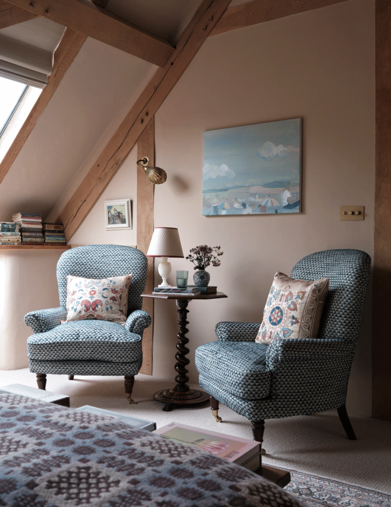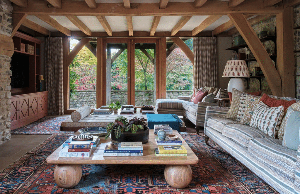 Το ισόγειο με ενιαία διαρρύθμιση περιλαμβάνει την κουζίνα και την τραπεζαρία στο ένα άκρο και το καθιστικό στο άλλο. Ένας εκτεταμένος χώρος που η Polly ένιωσε ότι έπρεπε να χωριστεί σε δύο, για διαφορετικές δραστηριότητες. «Το ένα είναι για συζήτηση και χαλάρωση μπροστά στο τζάκι και το άλλο για να παρακολουθείτε τηλεόραση» εξηγεί. Και οι δύο χώροι καθιστικού συνδέονται με πανομοιότυπα τραπεζάκια σαλονιού και ύφασμα ταπετσαρίας καναπέ.