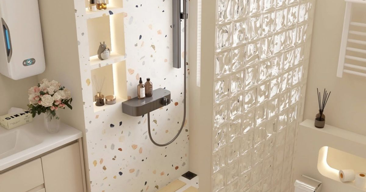Η εικόνα δείχνει ένα μοντέρνο και καλαίσθητο μπάνιο με ζεστούς, ουδέτερους τόνους και φυσικά υλικά. Στο κέντρο ξεχωρίζει η ντουζιέρα, η οποία έχει επένδυση τύπου terrazzo με ενσωματωμένα φωτιζόμενα ράφια για προϊόντα. Η λεπτομέρεια που κάνει τη διαφορά όμως είναι ο τοίχος από υαλοτούβλα που διαχωρίζει τη ντουζιέρα. Τα υαλοτούβλα δημιουργούν ένα παιχνίδι φωτεινότητας και σκιών, επιτρέποντας στο φως να περνάει άφθονο μέσα στο χώρο, ενώ ταυτόχρονα προσφέρει ιδιωτικότητα. Η επιφάνειά τους δίνει μια ελαφρώς ρετρό αλλά ταυτόχρονα πολύ σύγχρονη αισθητική, προσθέτοντας υφή και βάθος στο μπάνιο.