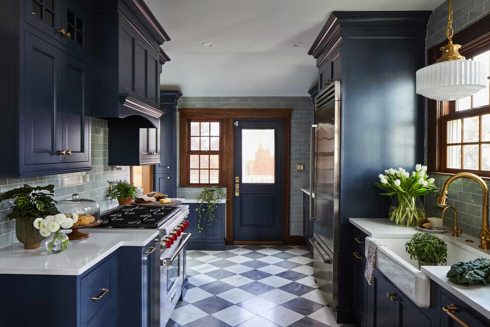 «Για μένα, οι κουζίνες που είναι ευάερες και φωτεινές μπορούν να φαίνονται αποστειρωμένες και κρύες και θα δείχνουν ξεπερασμένες πιο γρήγορα» παραδέχεται. «Μια κουζίνα σε χρώματα με πιο moody αποχρώσεις δημιουργεί έναν χώρο με ενδιαφέρον που είναι επίσης διαχρονικός». Υπάρχει κάτι λίγο απροσδόκητο σε μια κουζίνα που δεν είναι ολόλευκη που την κάνει δροσερή και φρέσκια. Το χρώμα, εξηγεί, δημιουργεί άμεση θαλπωρή – και επειδή η κουζίνα είναι ήδη ένας φυσικά άνετος χώρος, γιατί να μην στραφούμε σε αυτό με μια πιο σκούρα παλέτα;